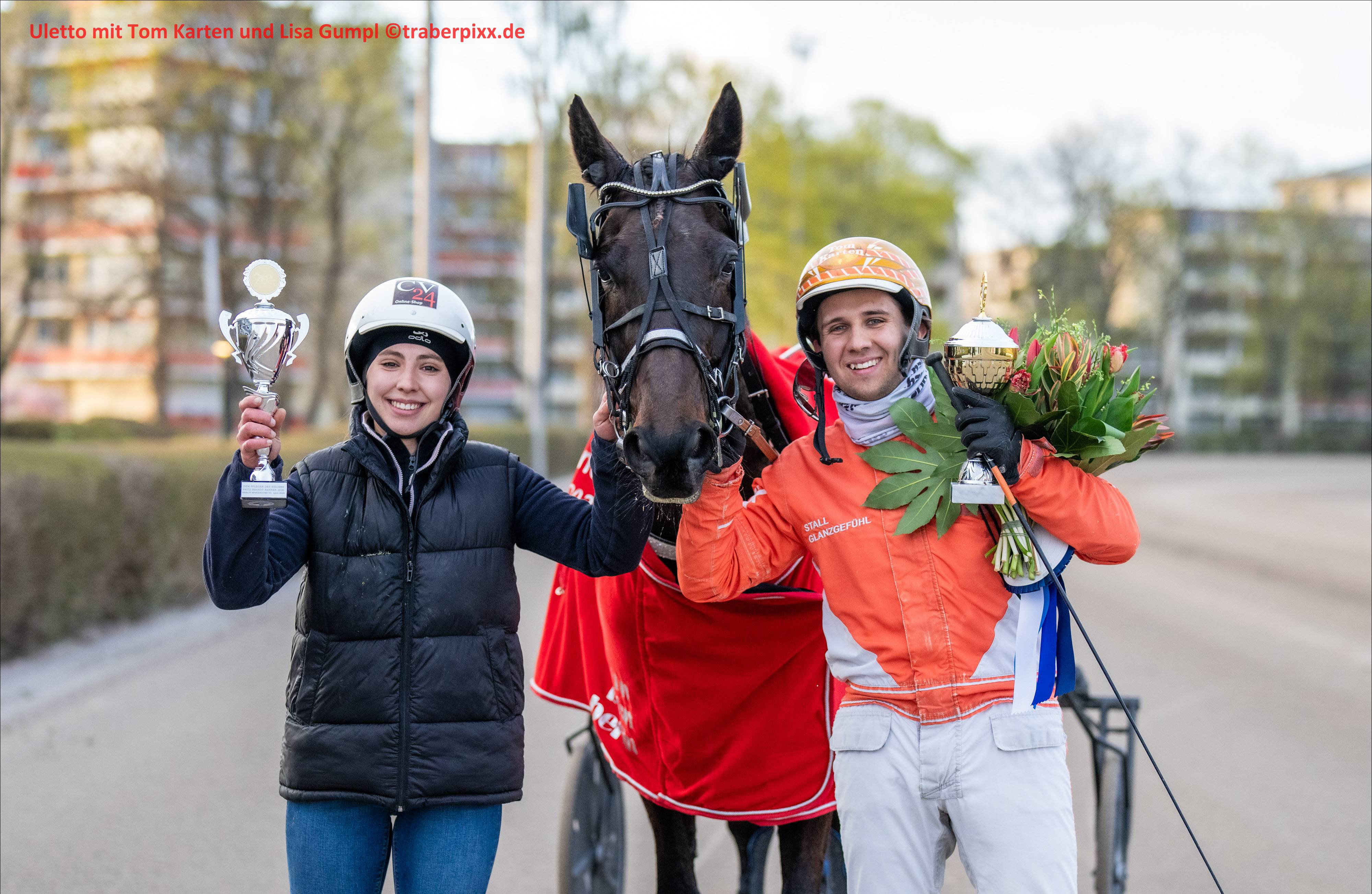 Für das Finale entschied sich Tom Karten für Uletto – genauso wie das Publikum, das den im Vorlauf nicht vom Renngeschehen begünstigten Wallach der Besitzergemeinschaft Reber/Werner auf den 3,0-Favoritenthron hob. Mit dieser Einschätzung des von Josef Franzl trainierten Fünfjährigen lagen die Zuschauer goldrichtig. Denn diesmal war der Verlauf ganz auf seiner Seite. Uletto trat blendend ein und konnte von der 2.000-Meter-Grundmarke aus sofort die Führung übernehmen. Auf der Gegenseite kämpfte sich die mit 20 Metern Zulage bedachte Olivia Greenwood mit Yanick Mollema zwar bis auf eine Länge heran. Doch der im Vergleich zum späteren Sieger deutlich weitere Weg erwies sich als zu steinig – am Ende blieb der vermeintlichen Hauptkonkurrentin nur der vierte Platz. Dafür entwickelten Tampa Bay und Maharani GB, die erneut von André Pögel und Sarah Kube gesteuert wurden, noch feine Reserven und belegten die Ränge zwei und drei. Eine echte Gefahr wurden die beiden für den einsam seine Kreise ziehenden Uletto, der Tom Karten zugleich den 250. Karriereerfolg bescherte, aber nicht. Der Wallach gab seinen Zweieinhalb-Längen-Vorsprung nicht mehr aus der Hand. Aufgrund eines technischen Defekts konnte keine Kilometerzeit genommen werden.