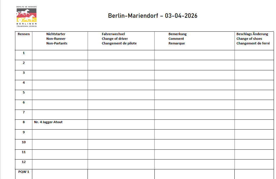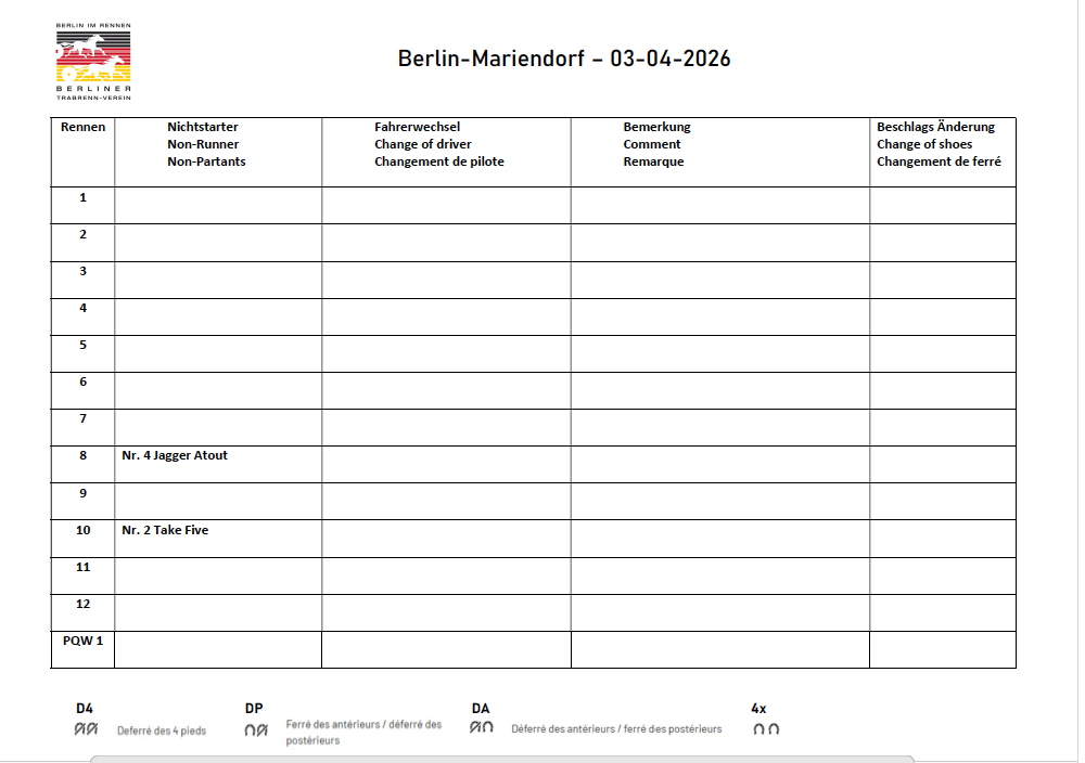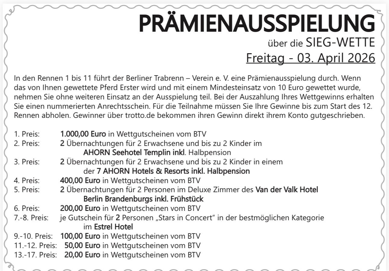 Große Prämienausspielung in der Siegwette. Entweder live auf der Bahn oder über www.trotto.de daran teilnehmen. Die Sachpreise werden Ihnen nach den Osterferien zugeschickt. |