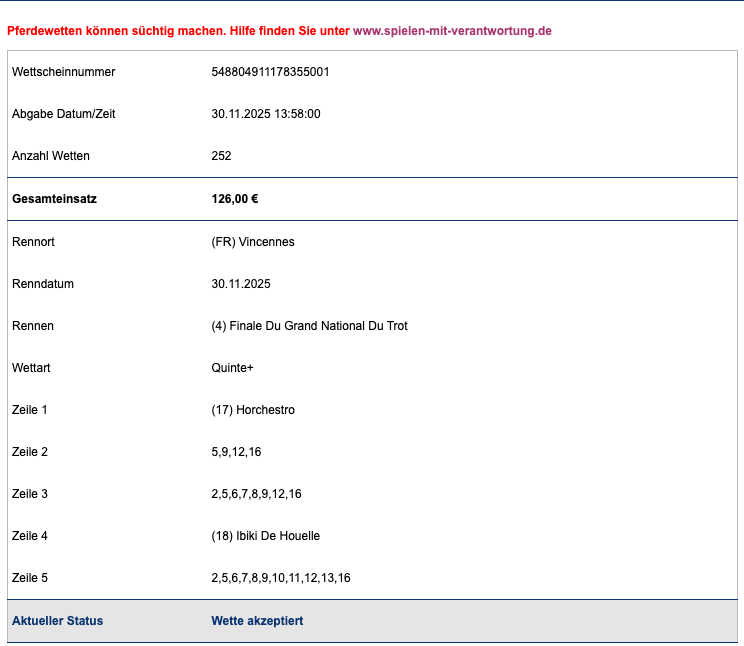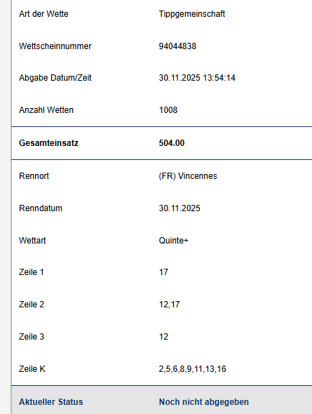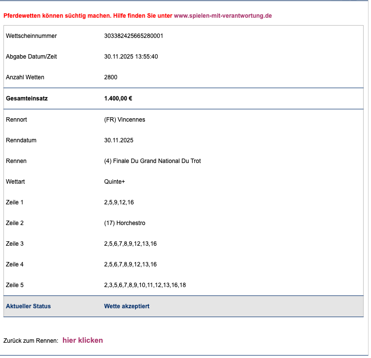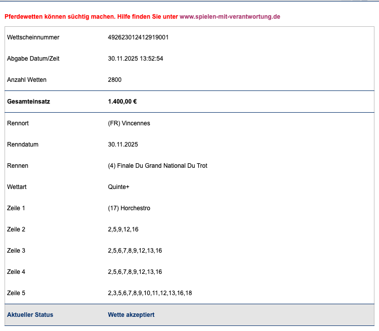 Wow, erstmal ein dickes Dankeschön für das Vertrauen und 294 Anteile. Vor allem Danke an und Ihr habt mit Eurem gestrigen Treffer, richtig Schwung in die Quinte-TG gebracht. Das war schon immer mein Traum...schwedisches Geld, wandert in den Franzosen-Toto 😂 So...Jetzt die finalen Scheine. Nach langer Überlegung habe ich Jingle du Pont (9) noch nach oben gezogen und hinten raus doch Ibiki de Houelle (18) an Fünf mitgenommen. Dazu noch ein "Hausfrauenschein" mit Ibiki an Vier. -- 17 2/5/9/12/16 2/5/6/7/8/9/12/13/16 2/5/6/7/8/9/12/13/16 2/3/5/6/7/8/9/10/11/12/13/16/18 a 50 Cent: 1.400 Euro -- 2/5/9/12/16 17 2/5/6/7/8/9/12/13/16 2/5/6/7/8/9/12/13/16 2/3/5/6/7/8/9/10/11/12/13/16/18 a 50 Cent: 1.400 Euro -- 17 5/9/12/16 2/5/6/7/8/9/12/16 18 2/5/6/7/8/9/10/11/12/13/16 a 50 Cent: 126 Euro -- Für alle, die in der Quinte nicht so "zu Hause" sind... Wichtig ist natürlich, dass Horchestro (17) 1/2 ist. Sollte das nicht klappen, dann sollte er zumindest unter den ersten Fünf sein, damit wir möglichst häufig die Desordre (beliebige Reihenfolge) treffen können. Allez Eric! |