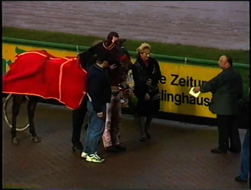 Anfang der 80er Heitmannshof Münster .Schwarze Asche tagelang Regen .Ich gewann ,Ulli auch noch ziemlich jung sprang bei der Siegerehrung aufs Sulky und fuhr mit.Keiner hatte an seinen langen Regenmantel gedacht,der sich ins Rad wickelte.Wie in Zeitlupe verabschiedete er sich neben mir in die metertiefe Bahn.Keiner konnte noch ernst bleiben als er wieder auftauchte,Ulli lachte am lautesten und wurde im Stall von Conny Heitmann mit den Pferden gewaschen. |
