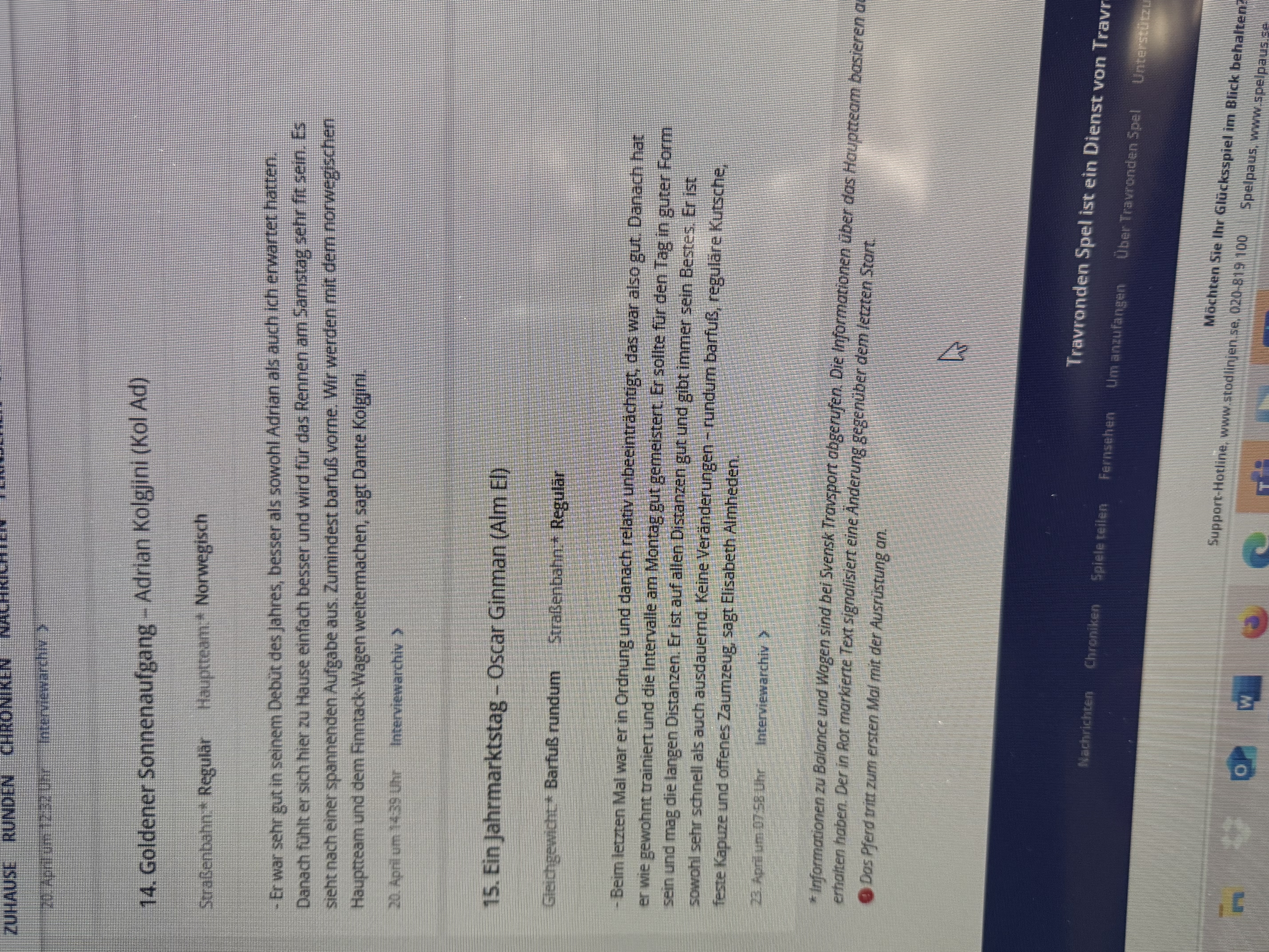 das ist auch nicht böse gemeint, ich lese immer alle Interviews bei Travronden durch zu allen Pferden, die dort gut gestaffelt sind, aber man muss da einen unheimlichen Filter ansetzen, was als Wetter wichtig ist und eher zu vernachlässigen ist. Zu A Fair Day schrieb die Trainerin: " Ihm ging es beim letzten Mal gut und er wirkte danach realtiv unbeeindruckt, das war gut. Er hat seitdem wie gewohnt trainiert und die Intervalle am Montag gut bewältigt. Er sollte für den Tag in guter Verfassung sein und mag die lange Distanz. Er ist auf allen Distanzen gut und gibt immer sein Bestes. Er ist sowohl sehr schnell und ausdauernd. Keine Änderungen barfuss, normale Tragweisse, fester Kopfschutz und offenes Kopfgeschirr". Das ist das offizielle Interview – und daraus kann ich die Aussage von Jörn so nicht herauslesen. Gleichzeitig möchte ich der Trainerin Elisabeth Almheden nichts unterstellen, was sie so möglicherweise gar nicht gesagt hat; ich habe jedenfalls keine entsprechende Stelle gefunden. Gerüchte oder Erzählungen von Dritten halte ich in dem Zusammenhang ohnehin für schwierig – gerade bei Einsätzen in dieser Größenordnung (um die 5.000 Euro). Solche Aussagen dann ungeprüft für bare Münze zu nehmen, wäre aus meiner Sicht schon ziemlich gewagt.