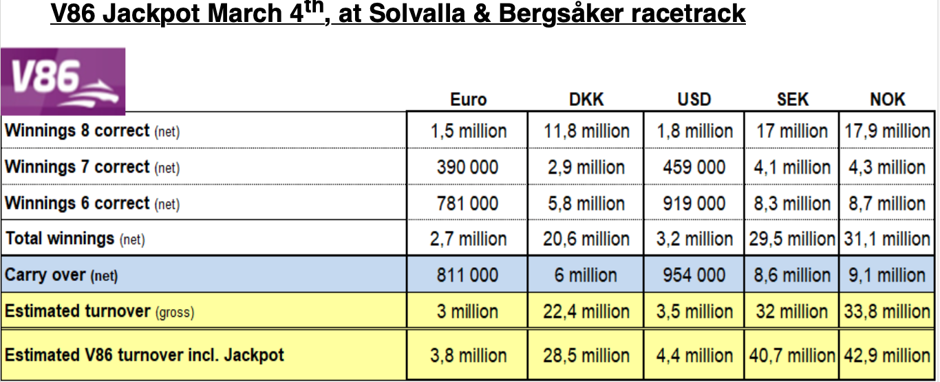 V86 Jackpot Mittwoch, 4. März in Solvalla & Bergsåker
