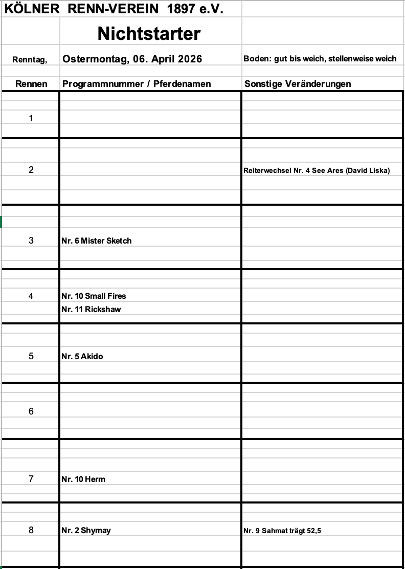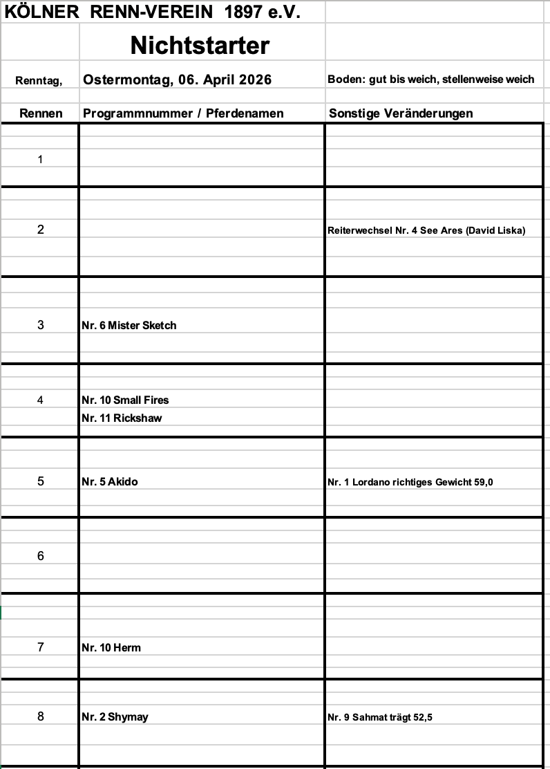 Boden: gut bis weich, stellenweise weich Zum Boden sagt der Kölner Renn-Verein: „Leider haben wir keinen Going Stick mehr für heute ausleihen können, daher erfolgte die Bodenmessung erneut auf Basis der „alten“ Messart. Der Boden ist heute am Renntag „gut bis weich, stellenweise weich“. Die Zielgerade ist etwas weicher als die Bögen und Gegenseite. Die Bahn wird bis heute Nachmittag noch leicht abtrocknen. Gestern gab es im Tagesverlauf noch zwei leichte Schauer mit unter 1mm Niederschlag. Die Temperaturen liegen bei 13-15 Grad, es ist sonnig und windstill. Für heute sind keine weiteren Niederschläge zu erwarten. Die Rennbahn ist im Schlussbogen ausgesteckt.“ |
