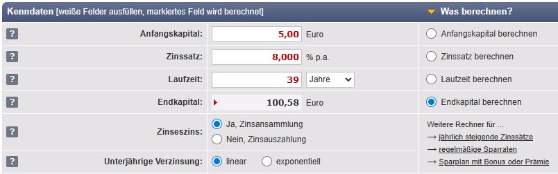 Passt mit den 100 € Aus 10 DM ( 5 € ) wären bei 8 % verzinst in 39 Jahren um die 100 € geworden |