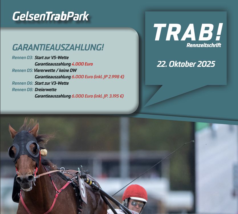 News Trab Das PDF-Rennprogramm für Gelsenkirchen (22.10.2025) von Andreas Gruber - vor 3 Stunden 0 News Trab, 21.10.2025Anbei zur PDF-Ausgabe für den Renntag am Mittwoch: 2025_10_22_Gelsen...