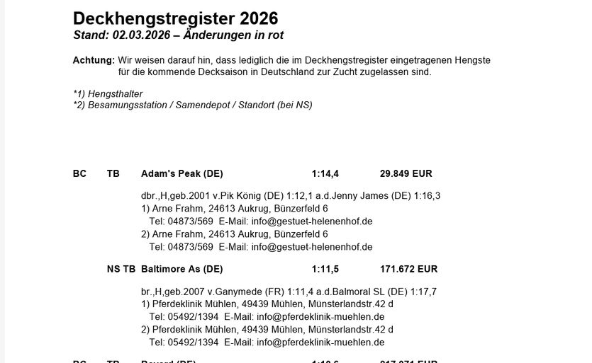 (hvt-press) Das Deckhengstregister 2026 im PDF-Format. Änderungen in Rot.