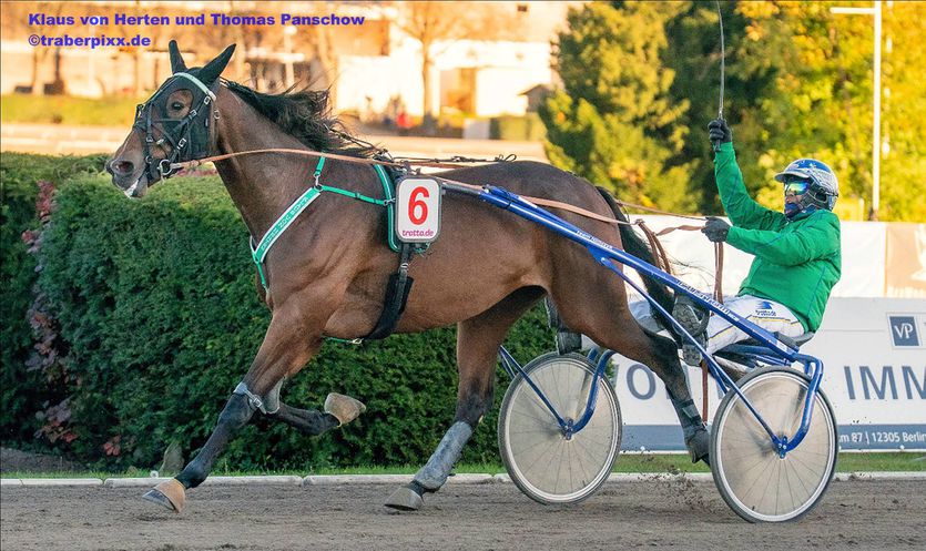 Sechs Breeders-Crown-Hauptläufe, eine Entlastung und drei weitere Rennen: Über 205.000 Euro Preisgeld und Züchterprämie wurden am zweiten Tag des Berliner Meetings an die Sieger und Platzierten verteilt. Und obwohl es natürlich immer eine subjektive Entscheidung ist, welche Pferde die meiste Aufmerksamkeit verdienen, stand der Hauptlauf der vierjährigen Hengste und Wallache besonders im Brennpunkt. Denn die Prüfung wies inklusive der fünfzehnprozentigen Züchterprämie mit über 38.000 Euro nicht nur die höchste Dotation der Sonntagveranstaltung auf, sondern sie war zugleich eine echte Derby-Revanche. Keine Geringeren als die beiden Erstplatzierten des wichtigsten deutschen Trabrennens, nämlich Summermusic’night S (Michel Rothengatter) und Aladin (Michael Nimczyk) gaben sich die Ehre. Aber sie wurden diesmal von einem kalt erwischt, der im August gar keine Derby-Nennung besessen hatte. Nämlich von Klaus von Herten, der zum dritten Mal in seiner Laufbahn Thomas Panschow anvertraut war.