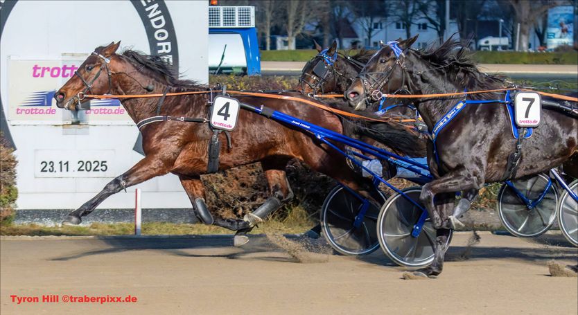 Sogar 20.000 Euro Preisgeld gab es im siebenten Lauf der Gold-Serie zu verdienen. Und so sehr sich Josef Franzl bereits über den Sieg von Ustinov gefreut hatte, so stolz durfte er nun gemeinsam mit Rolf Dürr – dem Besitzer des Pferdes – auf Tyron Hill sein. Denn der Hengst beherrschte das hochkarätig besetzte Rennen Start-Ziel und wies auf den ersten Metern nicht nur die vehemente Attacke des letztlich drittplatzierten Purple Rain (Robbin Bot) ab, sondern besaß auch noch die Kraft, sich dem Schlussangriff von Sangria Pellini (Michael Nimczyk) zu widersetzen. Unter Rekordverbesserung auf 12,8/1.900m verwies Tyron Hill die speedstarke Stute auf Rang zwei. Das war zweifellos ein kleines Wunder – denn nach einer 2024 erlittenen schweren Beinverletzung war Tyron Hills Rennlaufbahn eigentlich schon beendet. Doch nach einer erfolgreich verlaufenen Operation kehrte Tyron Hill nun dank seines eisernen Willens auf die Erfolgsbühne zurück. Keine Frage: Vor diesem Hengst muss man den Hut ziehen!