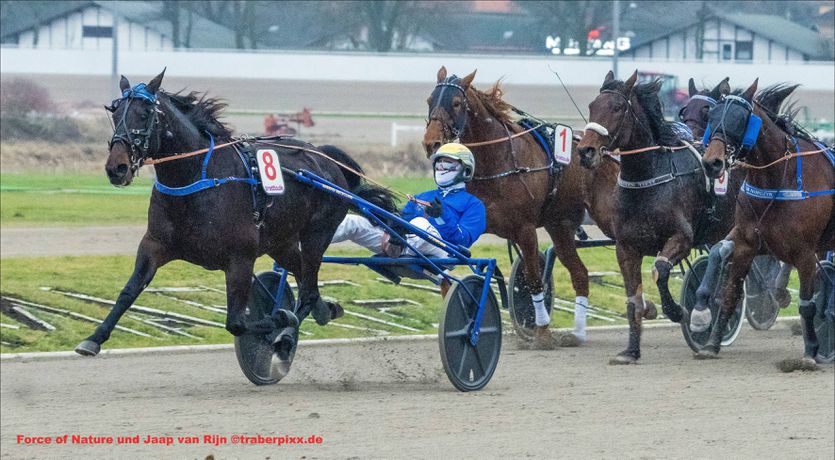 Im Gold-Lauf nahmen elf Sulkygespanne auf der langen 2.500-Meter Distanz den Wettstreit miteinander auf – verteilt auf zwei Bänder. Von der Grundmarke aus sah es bis in die Zielgerade hinein sehr gut für Postillion (Peter Platzer) aus, der sofort an die Spitze gegangen war. Doch während der Wallach auf den entscheidenden Metern nichts mehr zuzusetzen hatte, spielte der für 2,1-faches Geld gehandelte und von Jaap van Rijn gesteuerte Force of Nature ganz groß auf. Und das, obwohl er ein sehr anspruchsvolles Pensum abzuleisten hatte. Denn der holländische Goldhelm hatte seinen Schützling vor den Tribünen vom Feldende aus mit einem wuchtigen Vorstoß an Postillions Flanke beordert und kam auch im weiteren Verlauf aus der sogenannten Todesspur nicht mehr weg. Ende des Schlussbogens schien der erst vierjährige Hengst dem Kraftakt für einen kurzen Moment Tribut zollen zu müssen. Doch weit gefehlt – nachdem ihn Jaap van Rijn geradegestellt hatte, zog der von Erwin Bot für die Farben von Leendert Gerrits trainierte Traber mühelos wieder an und gewann in 1:14,6 min. mit zwei Längen Vorsprung. Die Ränge zwei und drei gingen an Waldgeist (Robbin Bot) und Sir Robert (Thorsten Tietz), die unterwegs stets im Vordertreffen gelegen hatten.