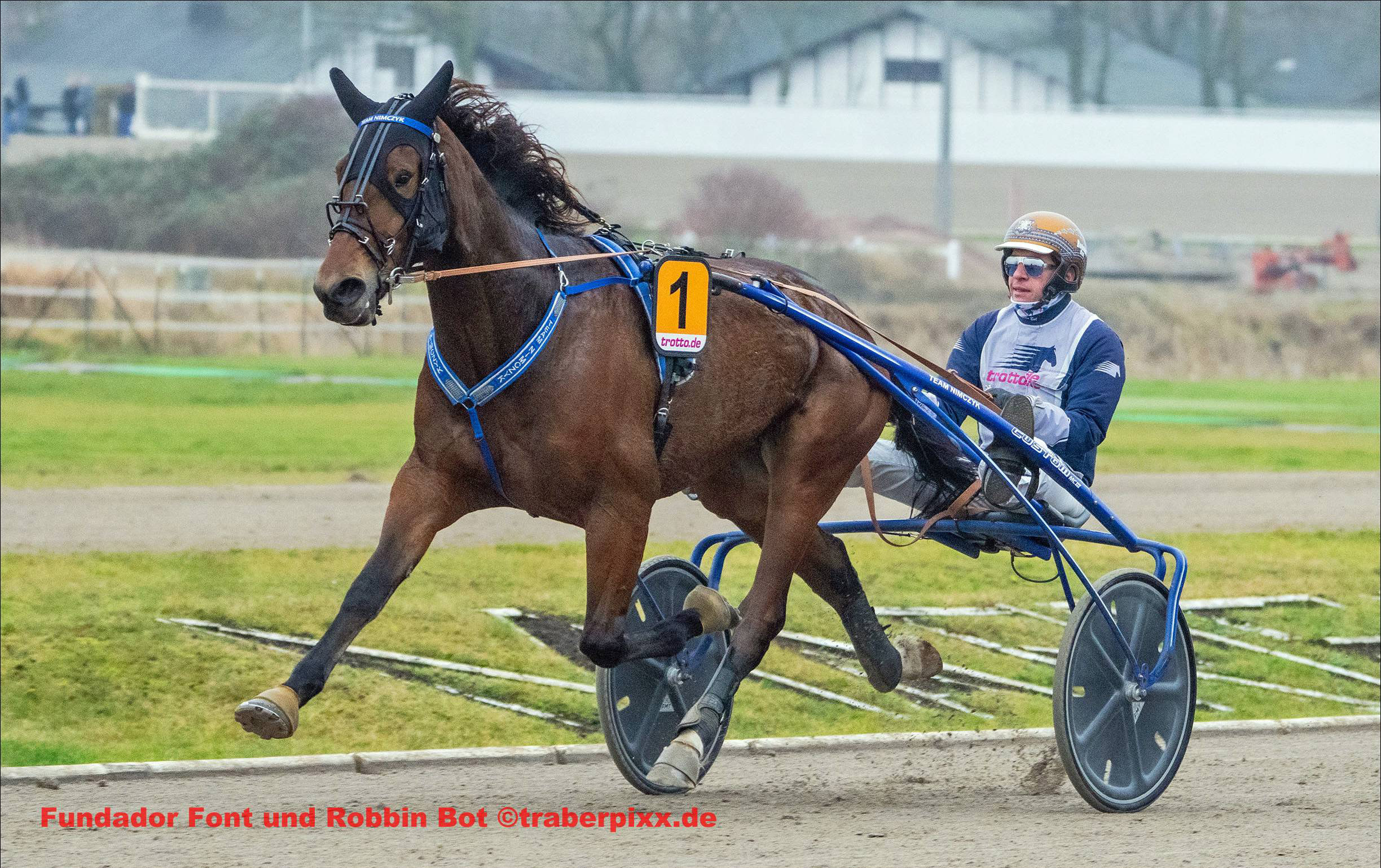 Bereits beim Auftakt der Veranstaltung ging es mächtig zur Sache, denn der von Josef Franzl präsentierte Sieger Ustranas Pippo verbesserte seine Rekordmarke in 14,1/1.900m um sage und schreibe 4,7 Sekunden! Dieselbe Steigerung galt auch für die zweit- und drittplatzierten Gaby Love Winner (Dennis Spangenberg) und Junique (Robbin Bot), die sich auf der Schlusshalben ein energiegeladenes Duell geliefert hatten, während Josef Franzl, der mit seinem Pferd lange im Mittelfeld gelegen hatte, nervenstark das Finish abgewartet hatte. Erst auf der Zielgeraden gab er Ustranas Pippo den Kopf frei und der Wallach zog mit zweieinhalb Längen Vorsprung souverän an seinen Gegnern vorbei. In taktisch ähnlicher Manier trumpfte im direkten Anschluss auch Robbin Bot mit Indigo des Baux auf, denn der Profi legte sich mit seinem Schützling ebenfalls gekonnt auf die Lauer und schickte die beiden Streithähne Kikri du Flot (Kornelius Kluth) und Henri de Jautais (Josef Franzl) auf den letzten hundert Metern in 14,2/2.020m auf die Verliererstraße. Mit Siegen wie diesem sorgt Robbin Bot im Gefecht um den Bronzehelm gegen Christoph Fischer weiterhin für Spannung und besitzt eine gute Chance, auch im kommenden Jahr die Kopfbedeckung aus Edelmetall zu tragen. Zumal der Holländer nur eine halbe Stunde später einen weiteren Punkt ergatterte. Und zwar mit Fundador Font, für den es bereits der fünfte Erfolg hintereinander war. Robbin Bot fackelte nicht lange und übernahm mit dem vor einer tollen Zukunft stehenden Wallach sofort die Führung. In 14,1/1.900m war Fundador Font eine Macht.