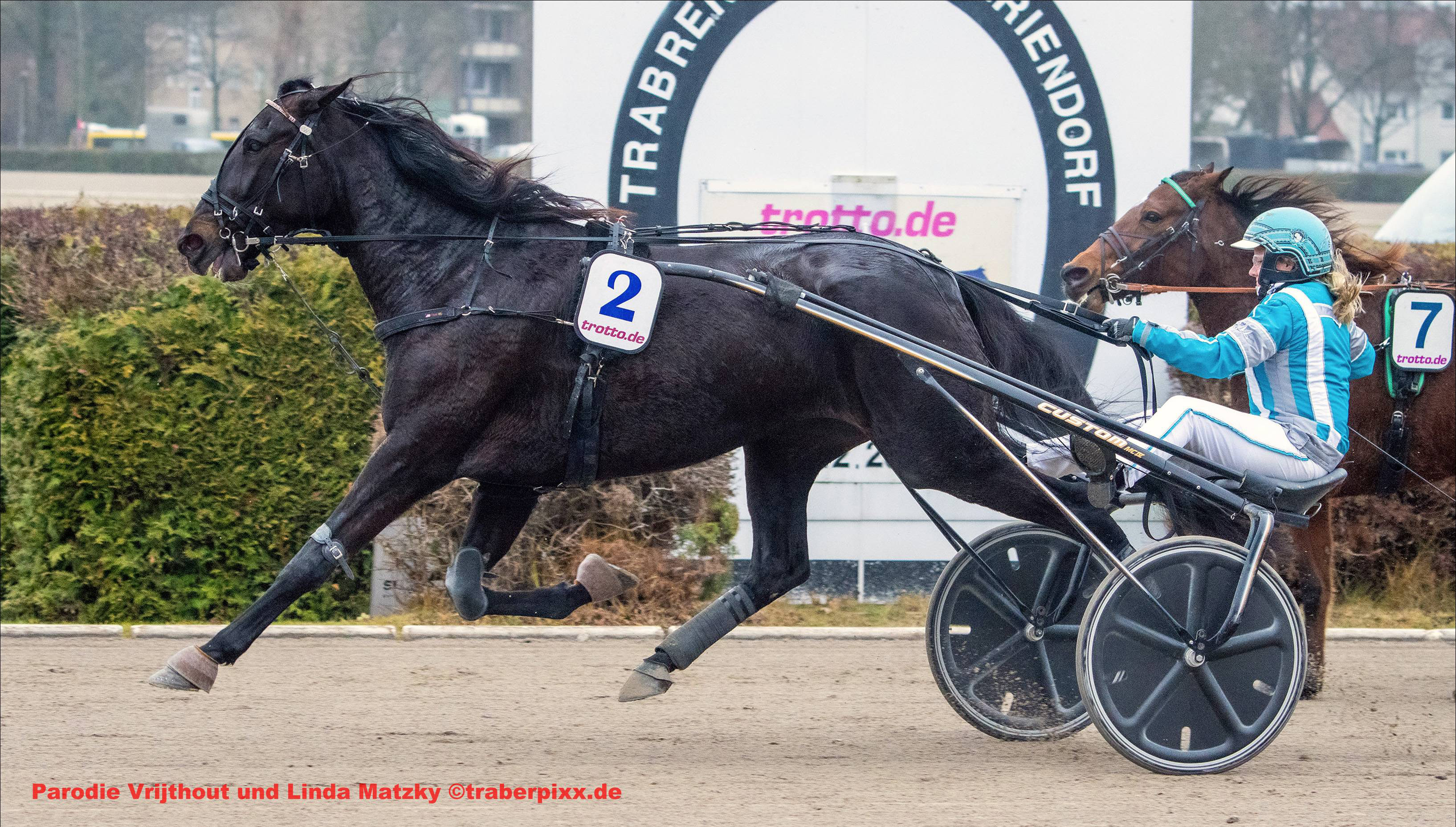Große Aufmerksamkeit genossen natürlich auch die beiden Amateurfahren der Veranstaltung, denn der Fight zwischen dem amtierenden Champion Tom Karten und seiner Herausforderin Emma Stolle gerät langsam, aber sicher in die heiße Endphase. 31:28 für Karten lautete die Ausgangslage, die zunächst unverändert blieb. Denn im ersten der beiden Rennen hatten beide Titelaspiranten nichts zu melden. Stattdessen wurde die Derby-Bahn einmal mehr zur Erfolgsbühne von Linda Matzky und Parodie Vrijthout. Die Stute begann vom Startplatz 2 aus etwas besser als gewohnt, fand im weiteren Verlauf in die Idealposition als viertes Pferd außen und spielte auf der Schlusshalben einmal mehr ihren höllischen Speed aus. Die Braune gewann in 14,3/1.900m ganz leicht mit anderthalb Längen Vorsprung.