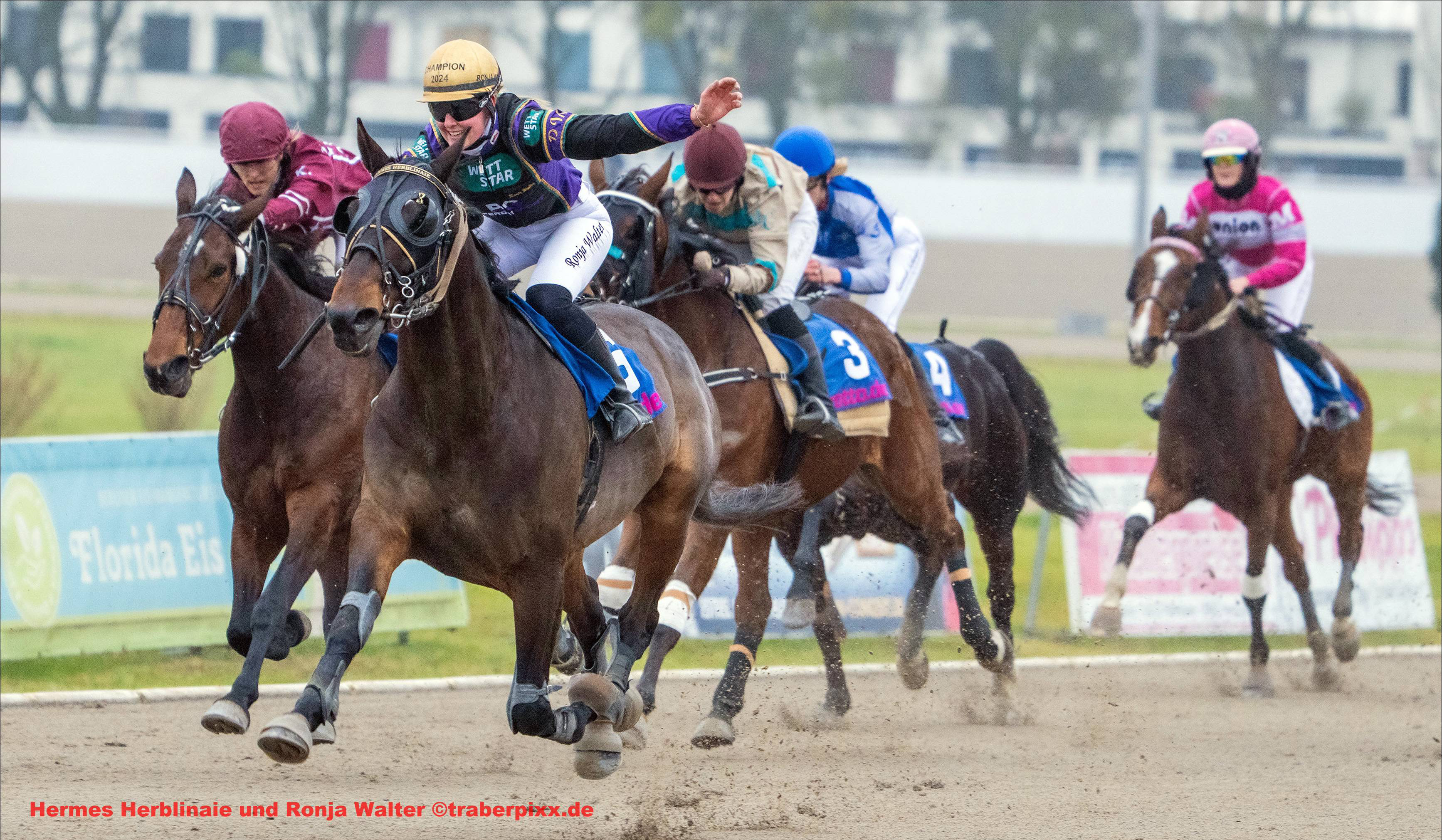 Zum Saisonabschluss gehörte natürlich auch das mittlerweile fast schon obligatorische Monté. Dass das ganze Jahr über in regelmäßigen Abständen Trabreiten auf der Derby-Bahn stattfanden, gehört zweifellos zu den erfreulichen Entwicklungen in Mariendorf. Der Sieg ging einmal mehr an Ronja Walter, die die Zügel von Hermes Herblinaie in ihre Hände genommen hatte und zum wiederholten Mal bewies, dass sie im Sattel des achtjährigen Franzosen nahezu unschlagbar ist. Obwohl es im Rennen lange nicht danach aussah. Selbst eine halbe Runde vor dem Ziel lag Hermes Herblinaie noch am Ende des Feldes. Doch während seine Konkurrenten auf der Zielgeraden auf der Stelle traten, wuchsen dem 2,1-Favoriten Flügel und er stürmte in 15,6/2.020m mit drei Längen Vorsprung an seinen Konkurrenten vorbei.