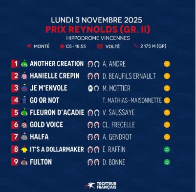 Der vor zwei Jahren im Prix des Elites (GR I) siegreiche Je M’Envole hat am 30. September im Prix Jean Mary wieder gewonnen. Auch diesmal wird er vorne 'plaquée' an den Start kommen, was derselben Konfiguration wie zuletzt entspricht.
